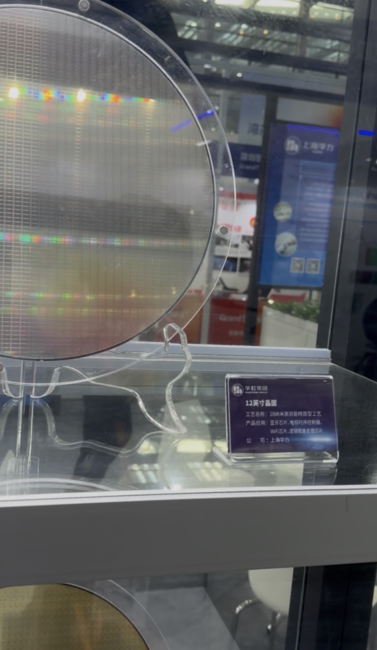 在华虹集团的展台上,展出了上海华力的12英寸晶圆。据介绍,使用其28纳米高效能精简型工艺,可用于蓝牙芯片、电视时序控制器、Wi-Fi芯片、逻辑图像处理芯片等产品。